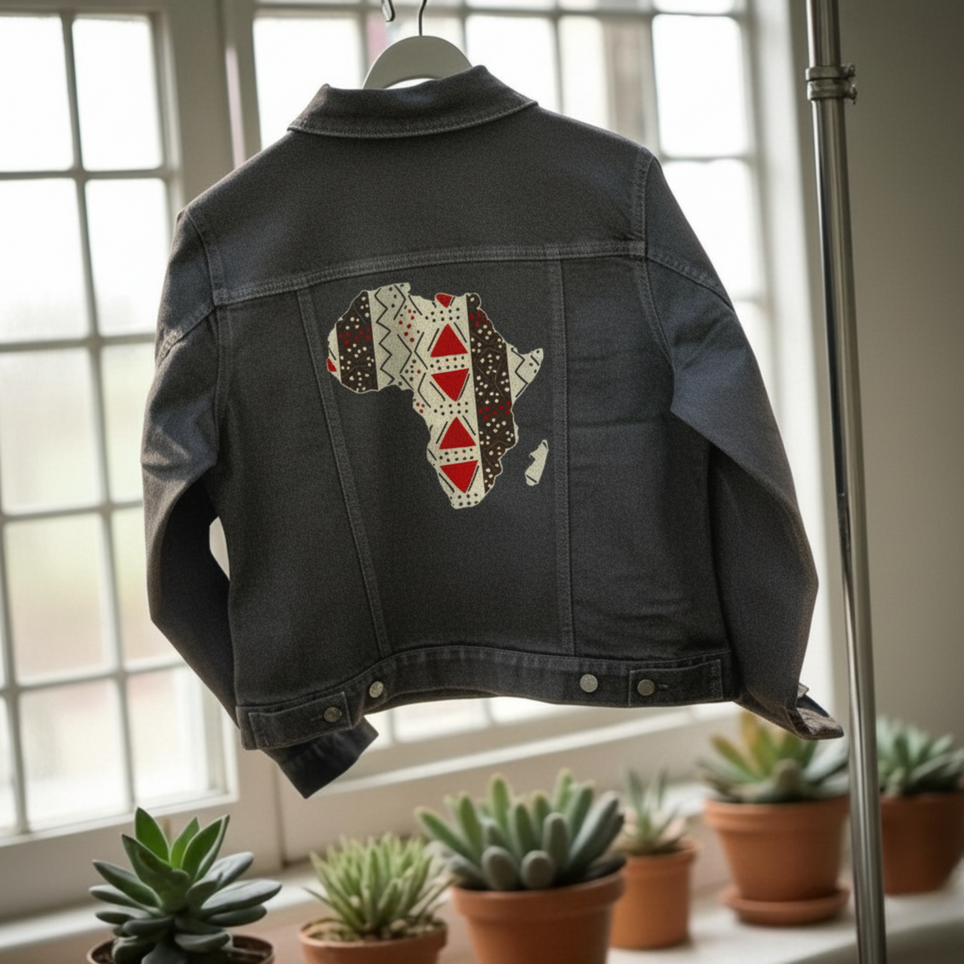 Customizable Kente & Africa Map Denim Jacket – Design Your Heritage