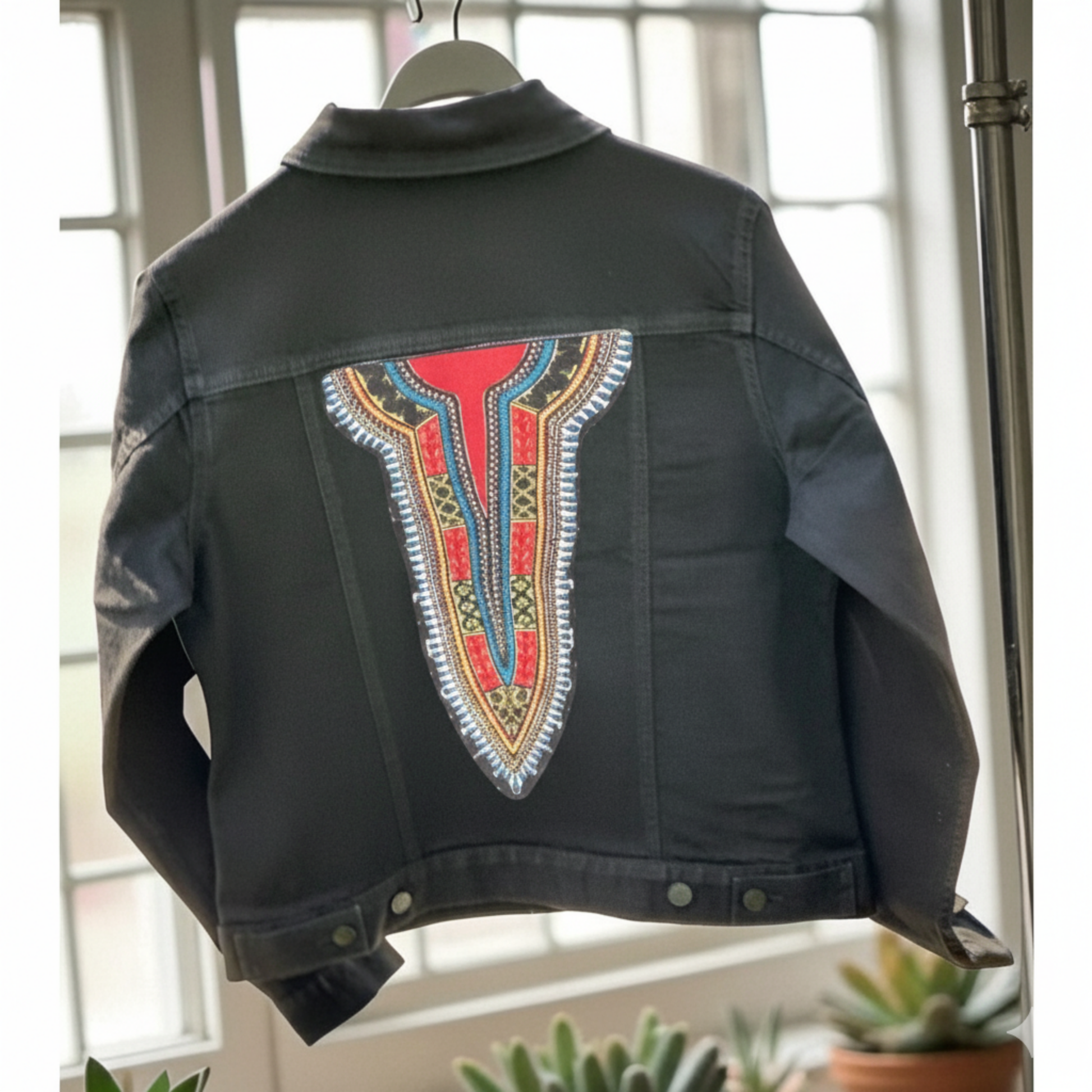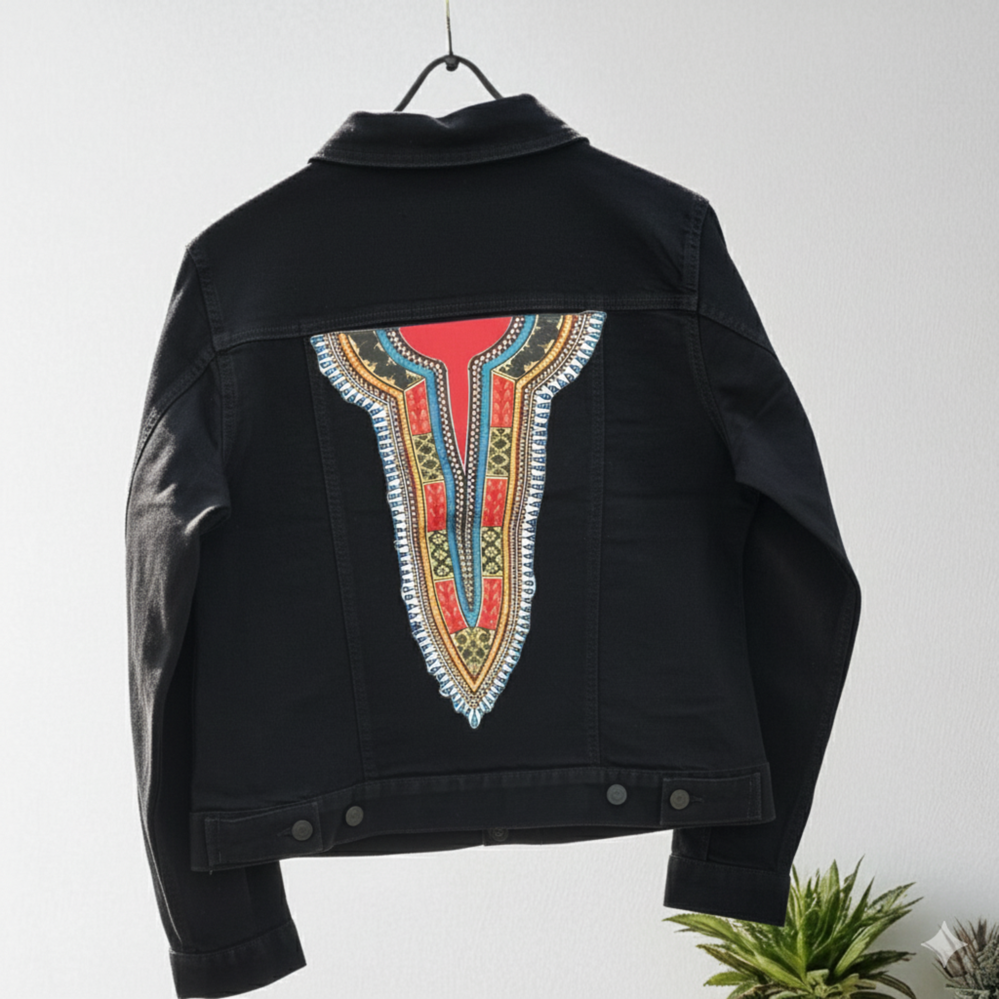 A modern classic with a cultural twist. This denim jacket features an authentic dashiki-inspired print on the back, turning everyday wear into a celebration of tradition. The vibrant colors and bold detailing make it a statement piece you’ll reach for again and again.